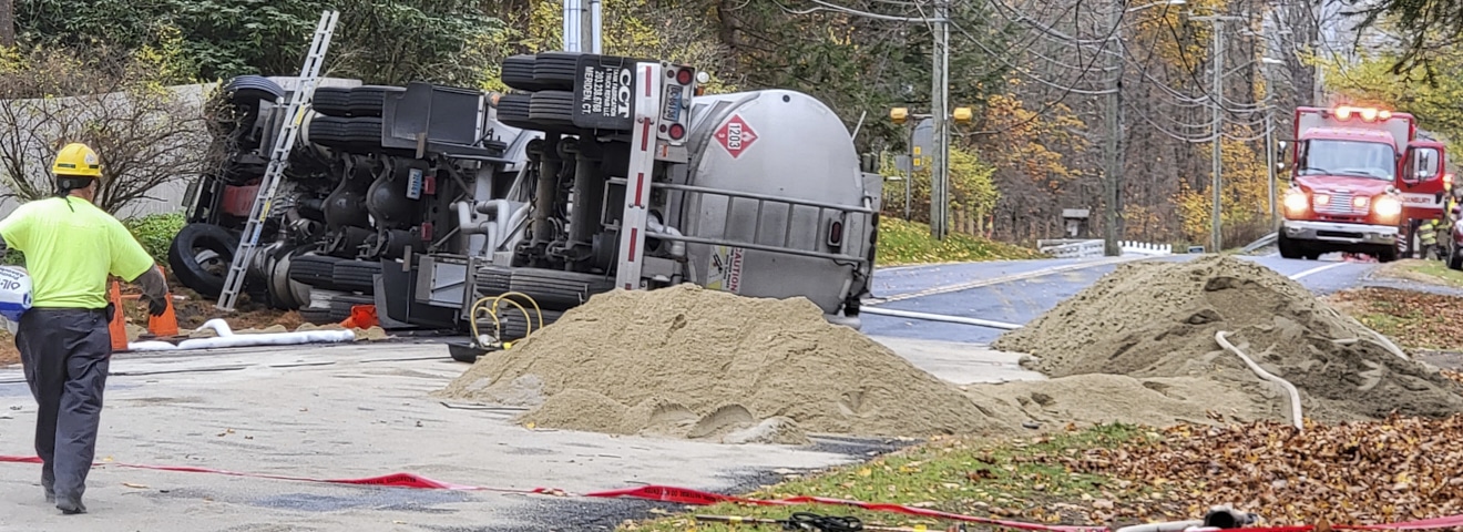 At 5:58 a.m. on Saturday morning, November 5, the Norfolk Volunteer Fire Department and Norfolk Lions Club Ambulance were dispatched to a reported gasoline tanker rollover in front of 97 Greenwoods Road East, also known as Route 44. Upon arrival of the first volunteers, the driver had self-extricated from the overturned cab and it was found that the tanker had been breached and was leaking gasoline onto the roadway. Further questioning of the driver revealed that he was carrying a full load of 8200 gallons of gasoline.